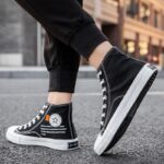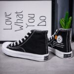 These classic high-top black canvas shoes blend style and functionality, adding a touch of cool to your everyday outfits. Crafted with premium canvas material, the upper is lightweight and breathable, ensuring long-lasting comfort. The white laces and toe cap contrast sharply with the black body, creating a minimalist yet distinctive look. The durable, non-slip rubber sole provides excellent traction, making it perfect for commuting, school, or casual outings. Whether paired with jeans, shorts, or skirts, these shoes effortlessly elevate your style, becoming a versatile staple in your wardrobe. Simple yet extraordinary, classic and timeless—an essential choice for your shoe collection!